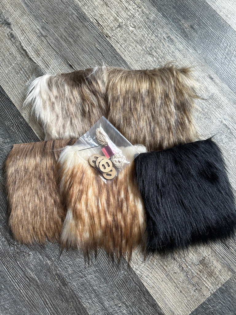 -5 DIY squares, black, cream, Bambi, nutmeg, wolf that measure to 6" poms. (L/XL)- needle- thread- 5 pom buttons-